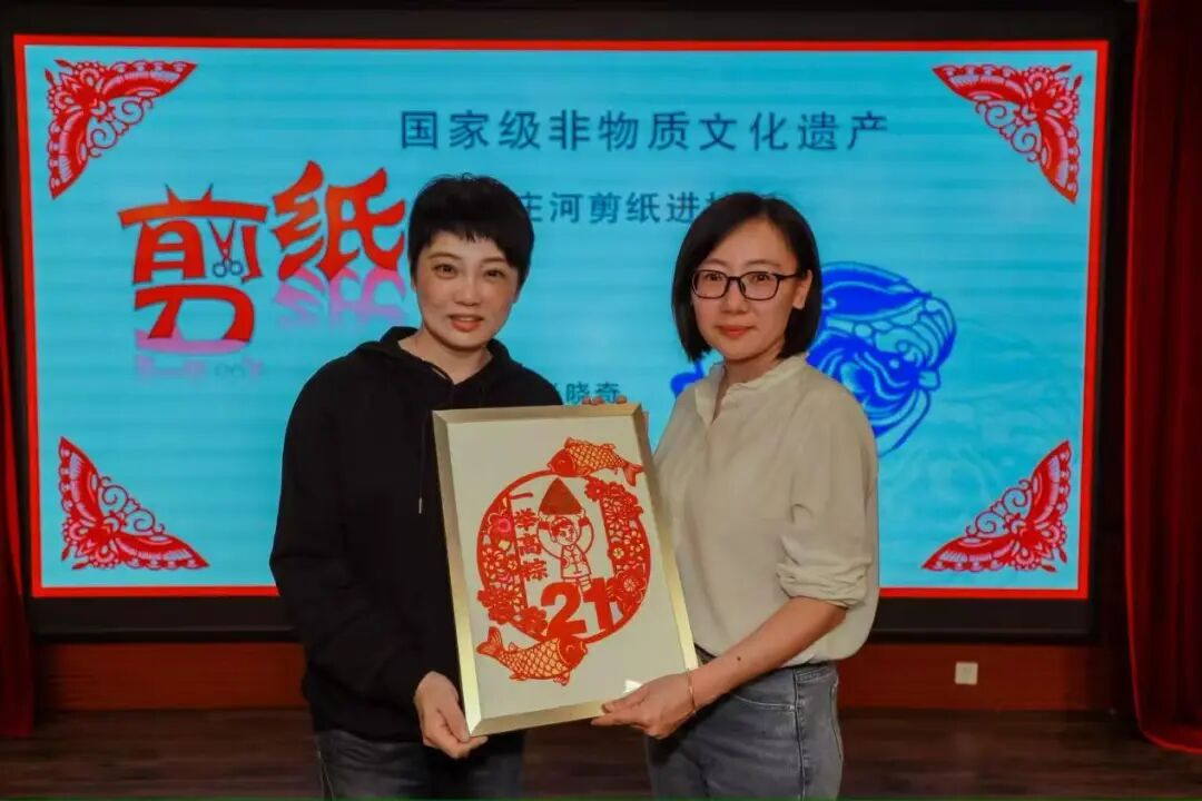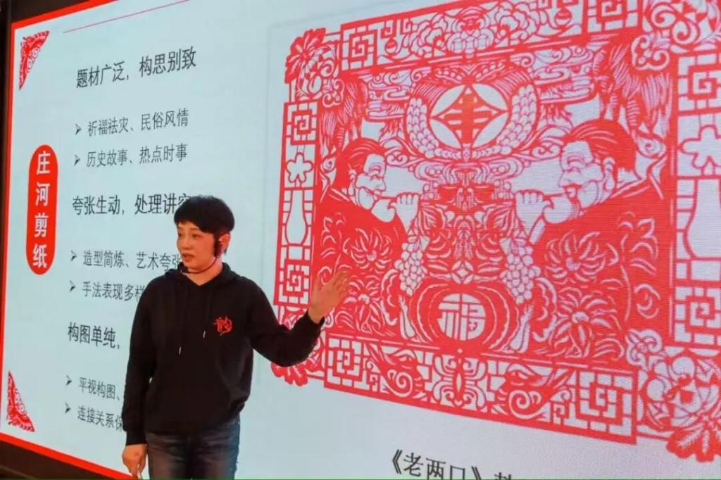 在庄河剪纸传统文化讲座环节,从中国剪纸的古老起源,到庄河剪纸中蕴含的民间祈福习俗,每一个知识点都引人入胜。国家级非物质文化(庄河剪纸)代表性传承人韩月琴的经典作品,如《生肖白菜》《老两口》等,作为生动案例,将地域文化和民俗风情娓娓道来。在深入浅出的讲解中,非遗技艺的神秘面纱被层层揭开,同学们得以深入领略这门艺术的深厚底蕴。