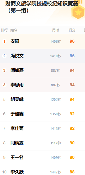 通过这次竞赛,同学们深刻地体会到,校规校纪不仅仅是一条条规定,更是引领我们成长、塑造良好品德和行为习惯的重要指南。此次线上竞赛,公司结合专业共分为五组,每组的前10名成绩和获奖情况如下。