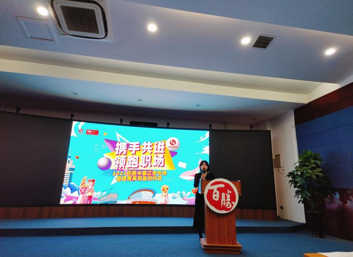 赵美玲经理首先致辞,赵经理介绍了公司和百胜餐饮集团近几年的合作成效,并指出校企联合订单培养为员工提供一个独特的学习平台,使大家能够在实际的工作环境中学习和成长,订单班的成立也标志着太阳成集团tyc9728和百胜餐饮(沈阳)有限公司的校企合作又迈上一个新台阶。