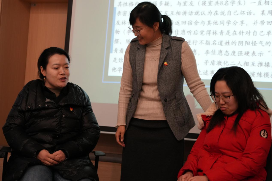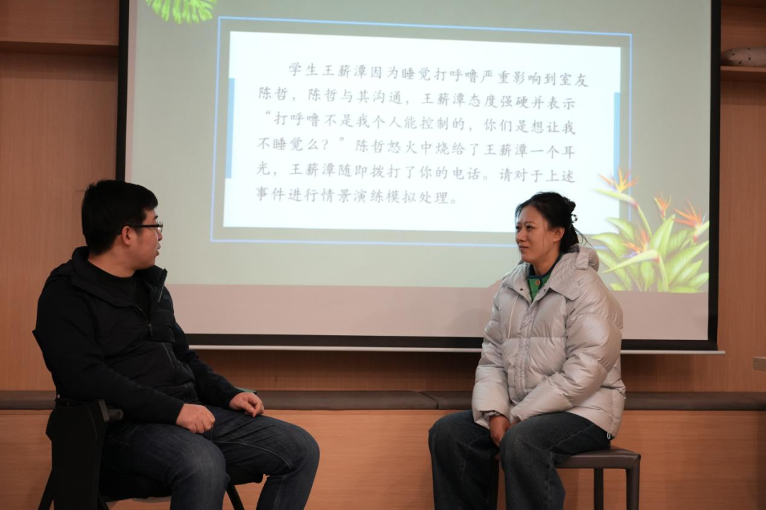 在率先进行的突发事件情景模拟演练环节,每个参赛小组随机抽取一个考题,随后由专兼职辅导员老师根据自身多年员工管理经验,进行突发事件处理,对“员工”提出的问题、面临的困难等进行适当的处理和耐心的解答,而“员工”也对老师敞开心扉,吐露出自己的困扰与内心最真实的想法。通过老师一句句耐心的劝导,每个“员工”都获益匪浅。现场气氛热烈、真实、温暖,充满欢声笑语的同时又引人深思,员工无小事,每一名专兼职辅导员老师都时刻肩负着责任与使命。